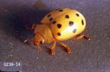 Pest description and crop damage Adult beetles are about 0.25 inch long. They are dome-shaped and yellow to copper brown with eight small black spots in three rows across each wing cover. Eggs are small and yellow. The mature yellow larva is about 0.6 inch long and covered with dark, branched spines. Pupae are yellow to copper color and about 0.25 inch.