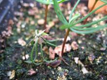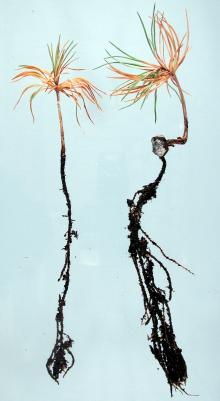 Post-emergence damping-off occurs when fungi infect the succulent tissue of germinants with aboveground shoots, causing decay, wilting, and death.6 Infection occurs on the stem at or slightly below the groundline14, 40 and on the roots.18 The infected tissue appears as a purple to brown lesion or as a dark water-soaked area that becomes sunken or constricted. In conifers, post-emergence damping-off results in wilting and collapse of the seedling.6, 14 Hardwood seedlings often remain upright as they wilt until the stem breaks off or rots away.40